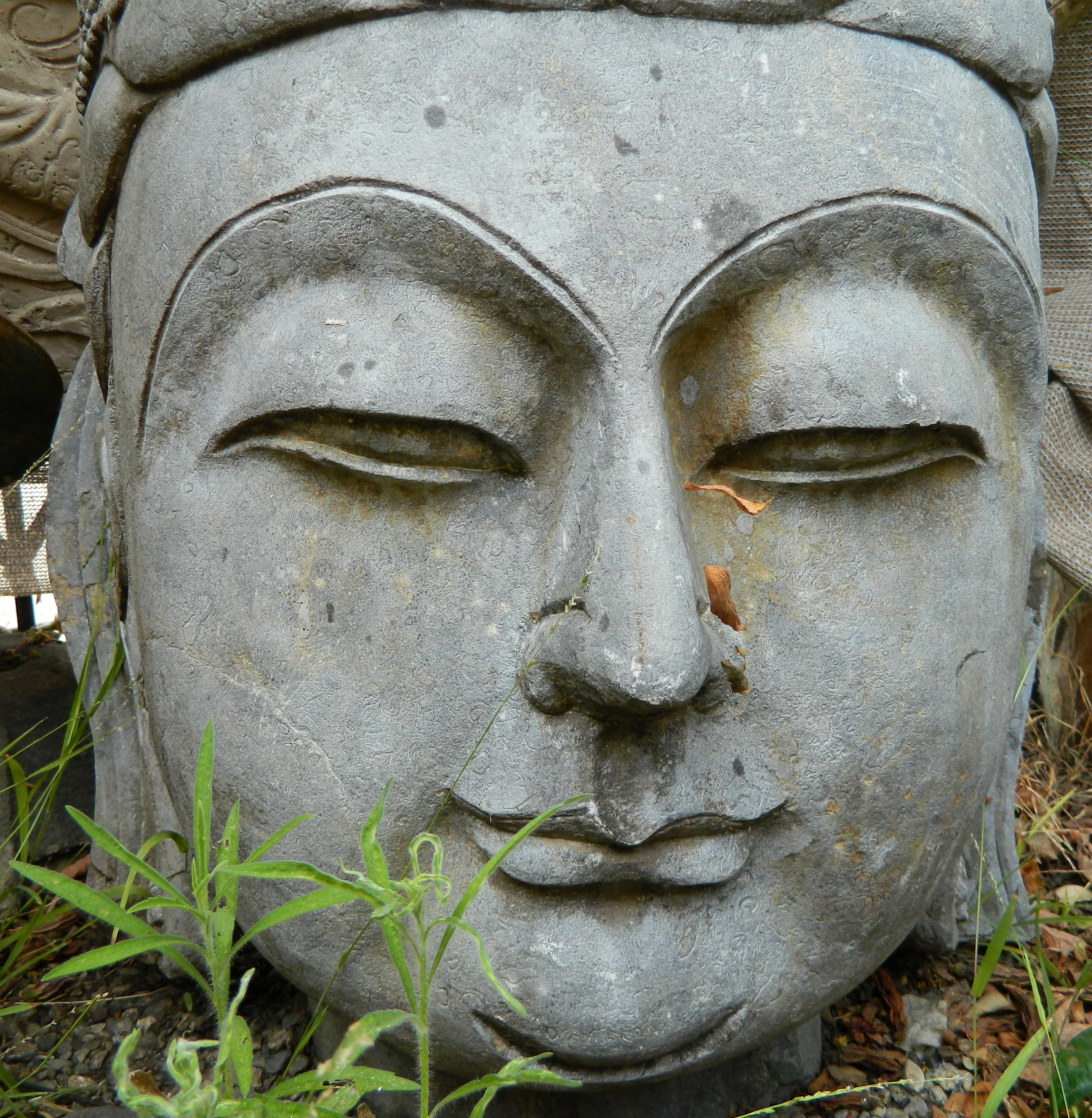(A stone Buddha head in an antique shop)